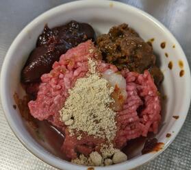 2、玉ねぎ、にんじんはみじん切りにして、1に入れる