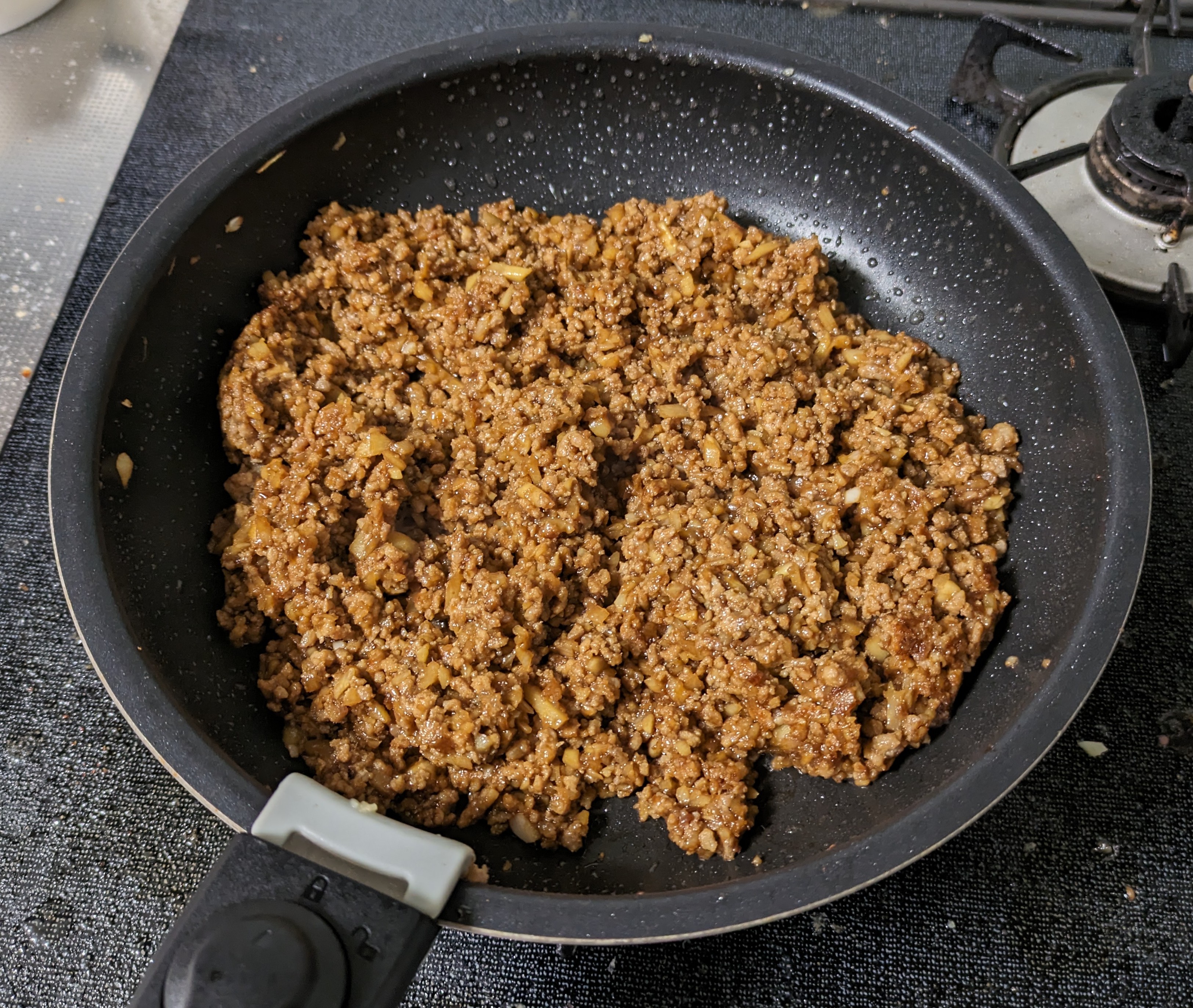 2、ごま油をフライパンに入れ、豚ミンチを入れ火が通るまで炒め、みじん切りしたタケノコとにんにく、しょうがチューブを入れてさらに炒めたら、★を混ぜたものを入れてさらに炒める